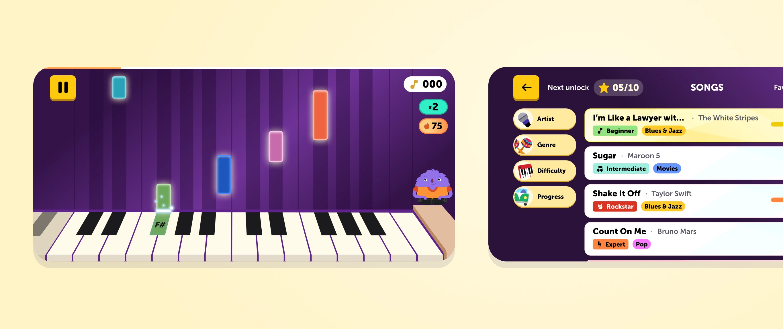 [[en]]Following the success of the guitar app, Loog introduced a new product: a piano. We joined them again to design a fresh version of the app, this time tailored to the piano’s unique interactions and flow. The new app built on our previous design work while exploring new animations, visuals, and gestures — all while staying true to the brand's educational mission and aesthetic.[[es]]Luego del éxito de la app de guitarra, Loog lanzó un nuevo producto: un piano. Nos volvimos a sumar al equipo para diseñar una nueva versión de la app, esta vez adaptada a la lógica y los flujos propios del piano. El nuevo diseño se basó en el trabajo previo, pero exploró nuevas animaciones, visuales e interacciones — manteniéndose siempre fiel al espíritu educativo y estético de la marca.